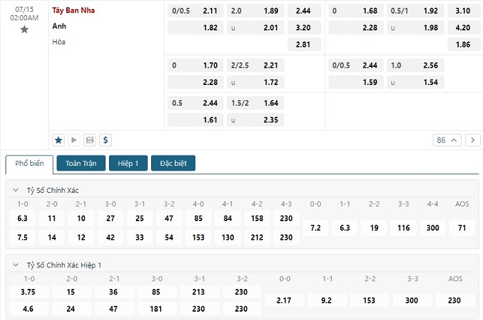 Bảng tỷ lệ kèo bóng đá trận đấu Tây Ban Nha vs Anh