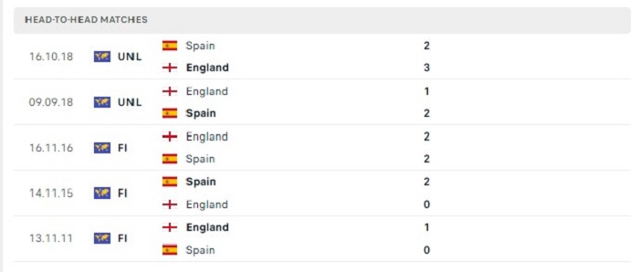 Các lần gặp nhau gần đây của Tây Ban Nha và Anh cũng đã có tỷ lệ ghi bàn tương đối cao trong trận, bằng chứng là 3 lần gặp nhau gần nhất đều có từ 3 bàn thắng ghi được trở lên và cả hai đội đều có thể ghi bàn đều đặn trong trận. Hàng thủ của Tây Ban Nha và Anh gần đây không thực sự chắc chắn và cũng thường phải nhận bàn thua, chính bởi vậy mà tỷ số trận đấu sắp tới hoàn toàn có thể xuất hiện nhiều trong trận .