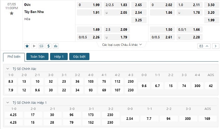 Bảng tỷ lệ kèo bóng đá trận đấu Tây Ban Nha vs Đức