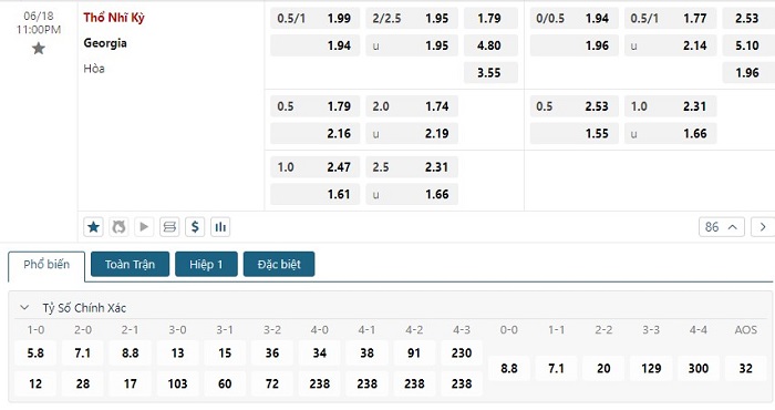 Bảng tỷ lệ kèo bóng đá trận đấu Thổ Nhĩ Kỳ vs Georgia