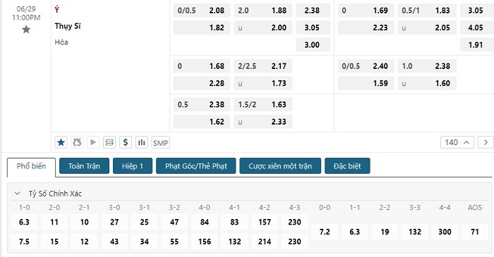 Bảng tỷ lệ kèo bóng đá trận đấu Thụy Sĩ vs Ý