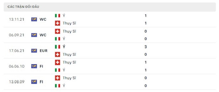 Lịch sử đối đầu của Thụy Sĩ vs Ý