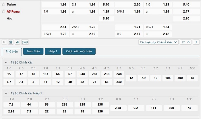 Bảng tỷ lệ kèo bóng đá trận đấu Torino vs AS Roma