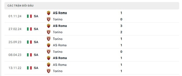 Lịch sử đối đầu của Torino vs AS Roma
