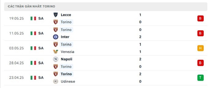 Phong độ gần đây Torino vs AS Roma