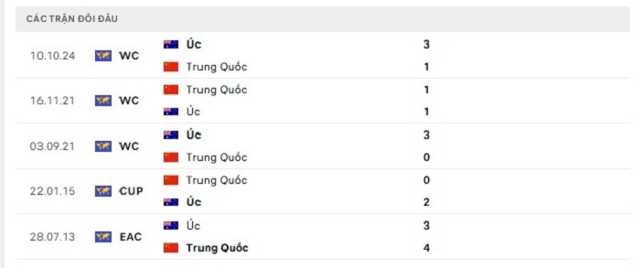 Bảng  bóng đá trận đấu Trung Quốc vs Australia