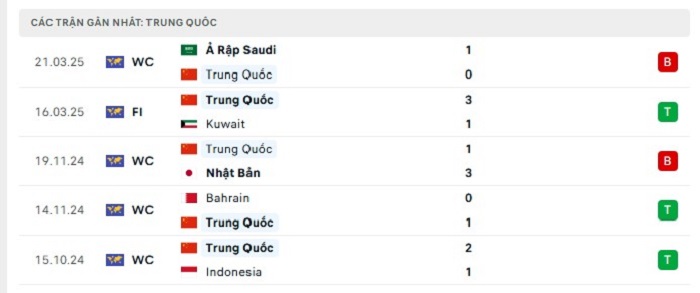 Phong độ gần đây Trung Quốc vs Australia
