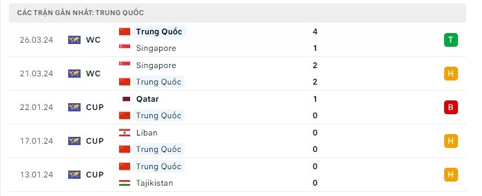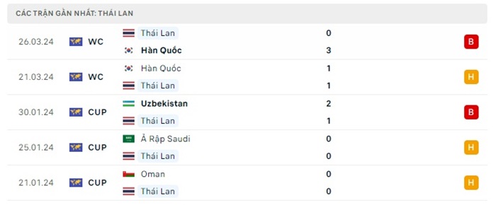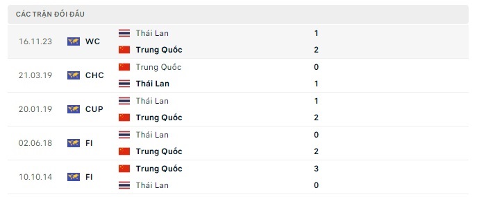 Phong độ gần đây Trung Quốc vs Thái Lan