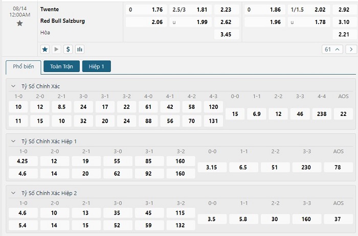 Bảng tỷ lệ kèo bóng đá trận đấu Twente vs Red Bull Salzburg