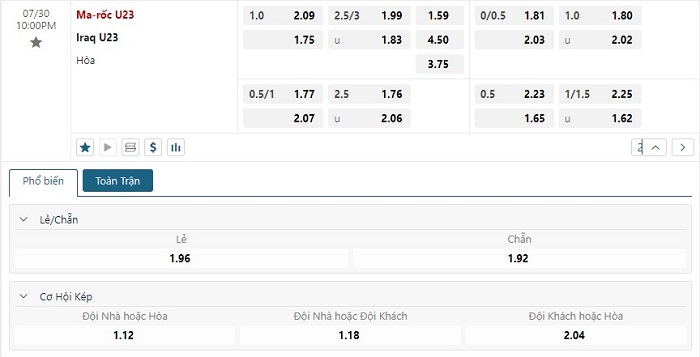 Bảng tỷ lệ kèo bóng đá trận đấu U23 Ma-rốc vs U23 Iraq