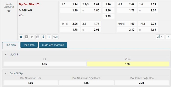 Bảng tỷ lệ kèo bóng đá trận đấu U23 Tây Ban Nha vs U23 Ai Cập