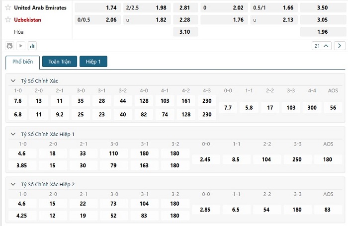Bảng tỷ lệ kèo bóng đá trận đấu UAE vs Uzbekistan