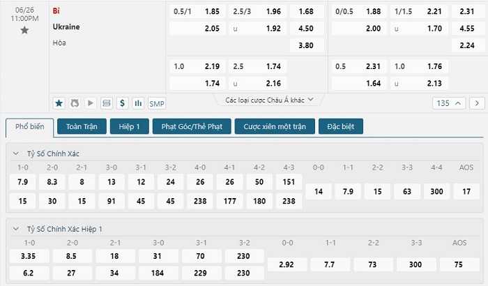 Bảng tỷ lệ kèo bóng đá trận đấu Ukraine vs Bỉ