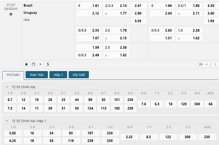 Bảng tỷ lệ kèo bóng đá trận đấu Uruguay vs Brazil