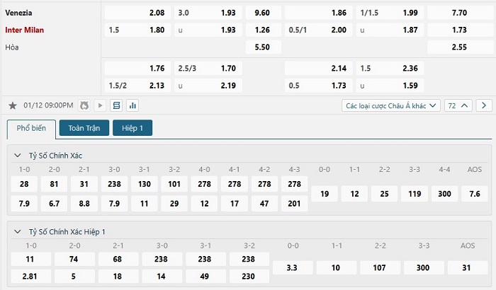 Soi kèo tỷ số Venezia vs Inter Milan