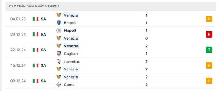 Phong độ gần đây Venezia vs Inter Milan