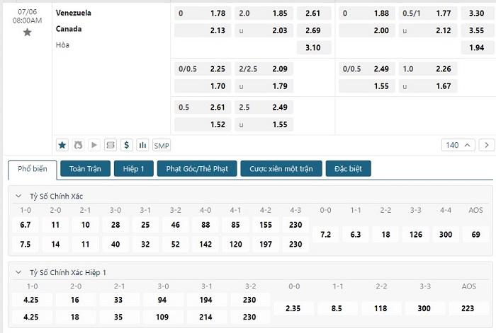 Bảng tỷ lệ kèo bóng đá trận đấu Venezuela vs Canada