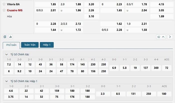 Bảng tỷ lệ kèo bóng đá trận đấu Vitoria vs Cruzeiro
