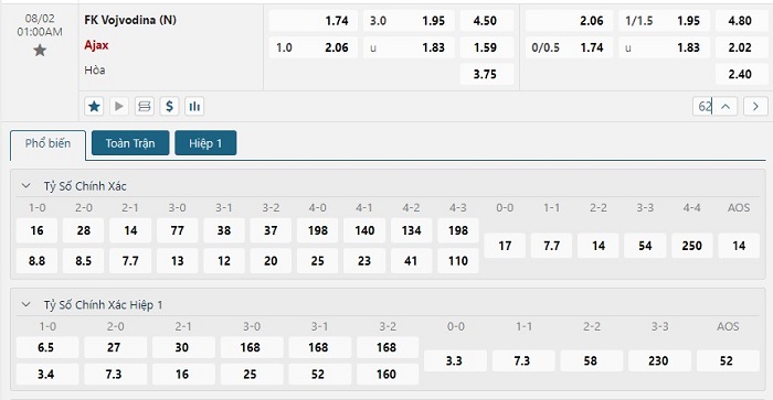 Bảng tỷ lệ kèo bóng đá trận đấu Vojvodina vs Ajax Amsterdam