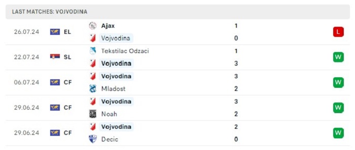 Phong độ gần đây Vojvodina vs Ajax Amsterdam