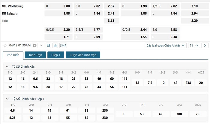 Bảng tỷ lệ kèo bóng đá trận đấu Wolfsburg vs RB Leipzig