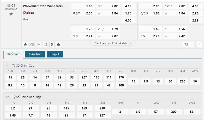 Bảng tỷ lệ kèo bóng đá trận đấu Wolverhampton vs Chelsea